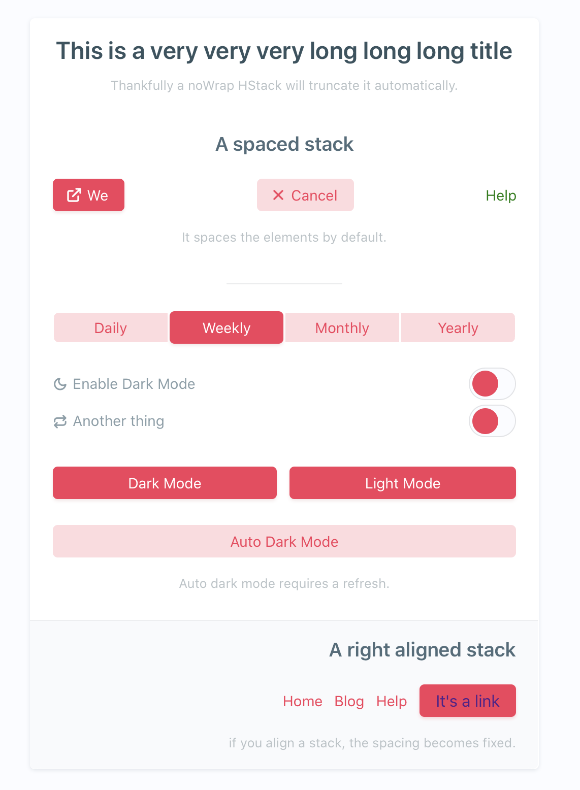 I have been an iOS developer for years and took the idea of stacks from the recently released SwiftUI to the web. Stacks come in two forms, horizontal (HStack) and vertical (HStack) and allow to easily layout content in both directions. They abstract over Flexbox and allow to set the gap between the contained elements easily, something you can’t do with the current version of Flexbox (at the container level):