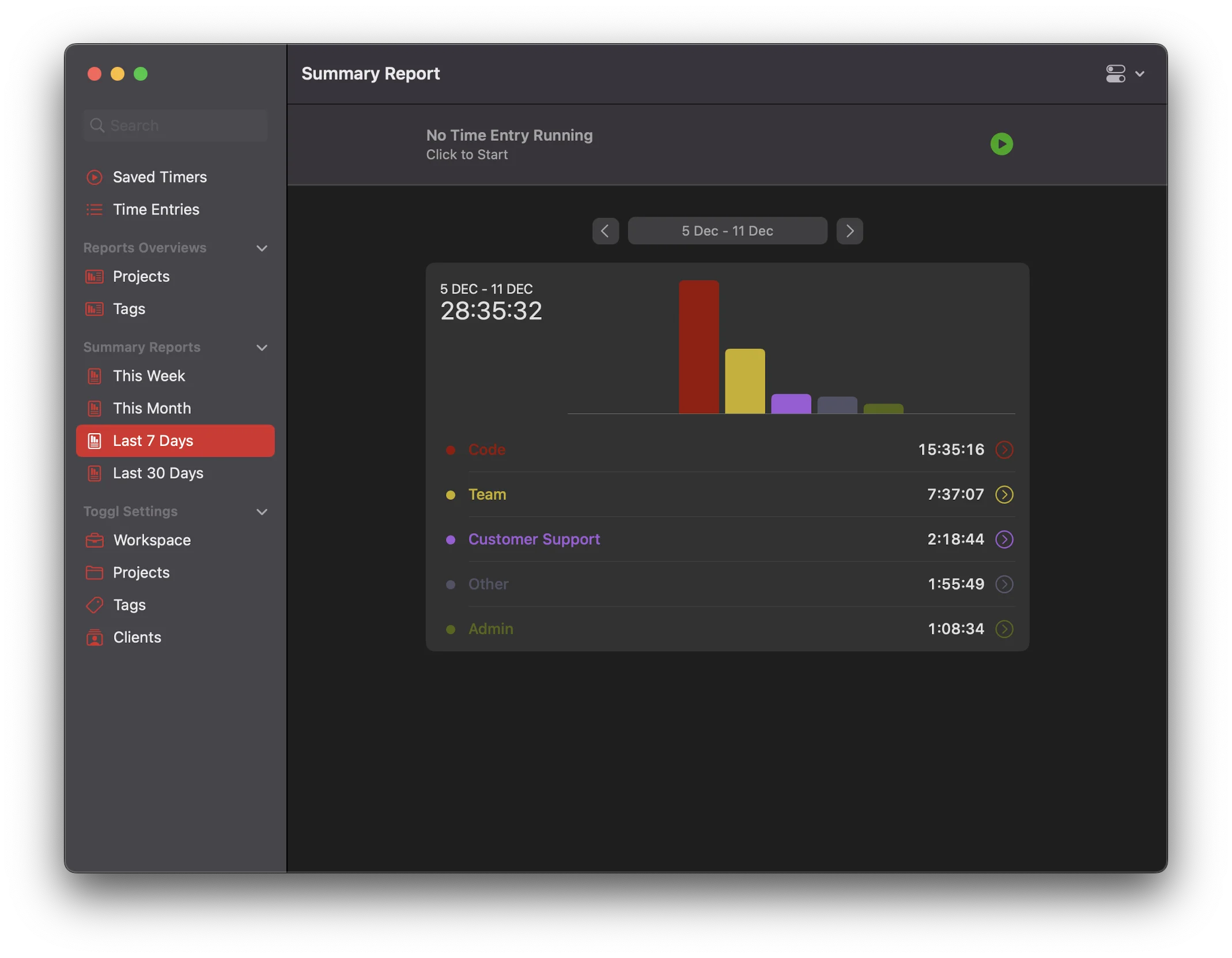 I try to hit an average of 7 hours worked per day. Some days it’s less, some days it’s more. I use 5 categories to see where my times goes:
