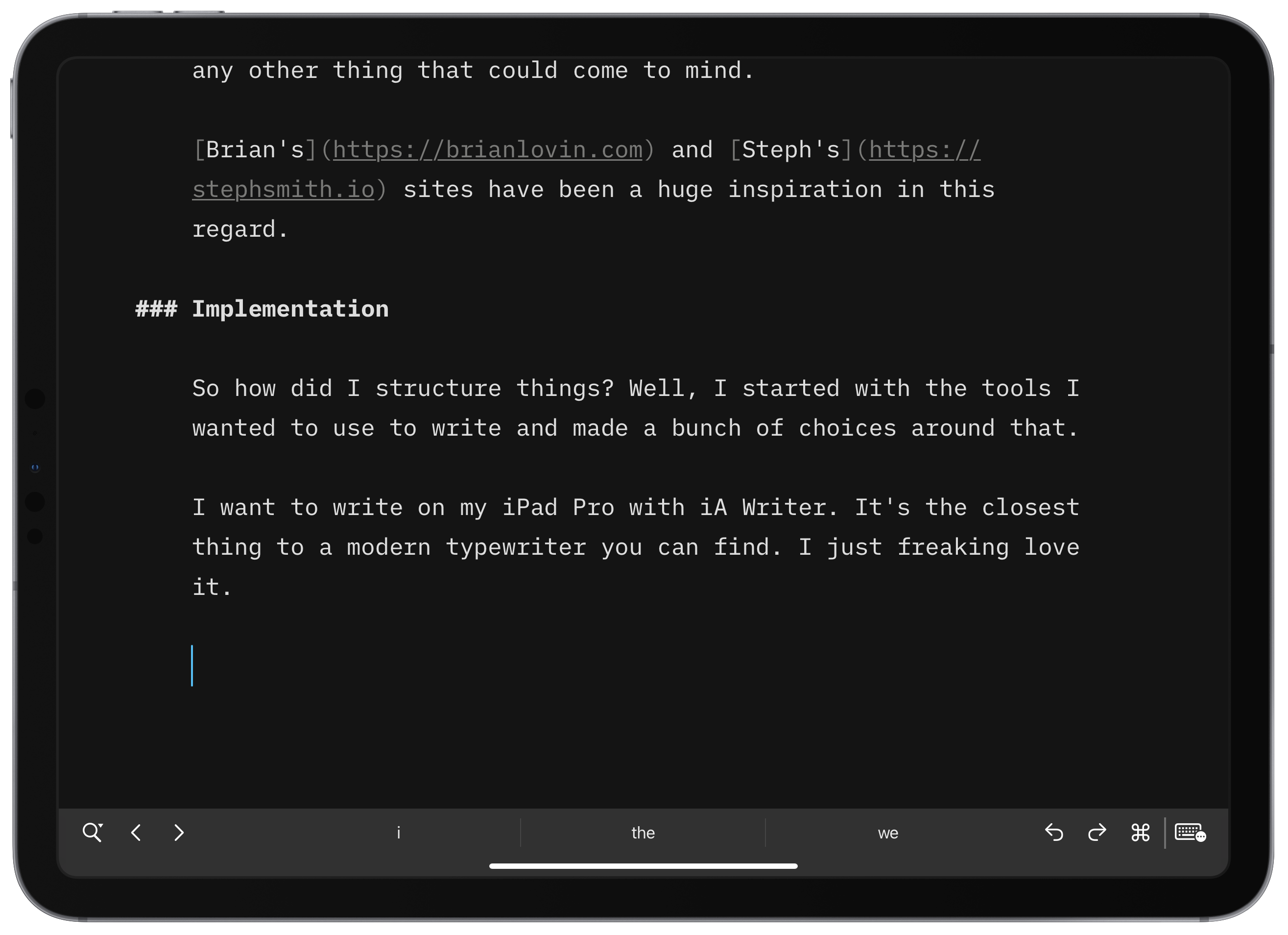 I want to write on my iPad Pro with iA Writer. It’s the closest thing to a modern typewriter you can find, especially when paired with an external keyboard. I just freaking love it.